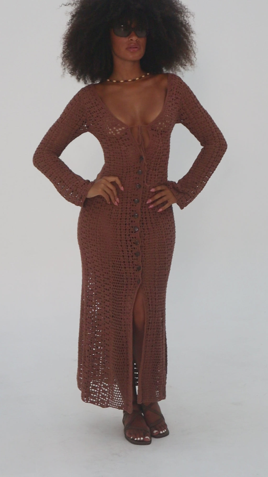 Lago Maxi in Cacao is a long maxi cover-up with a button-down front and adjustable tie at the bust. Designed with long sleeves and a subtle flared cuff for an easy, relaxed fit. Lightweight and breathable for beach and resort wear.